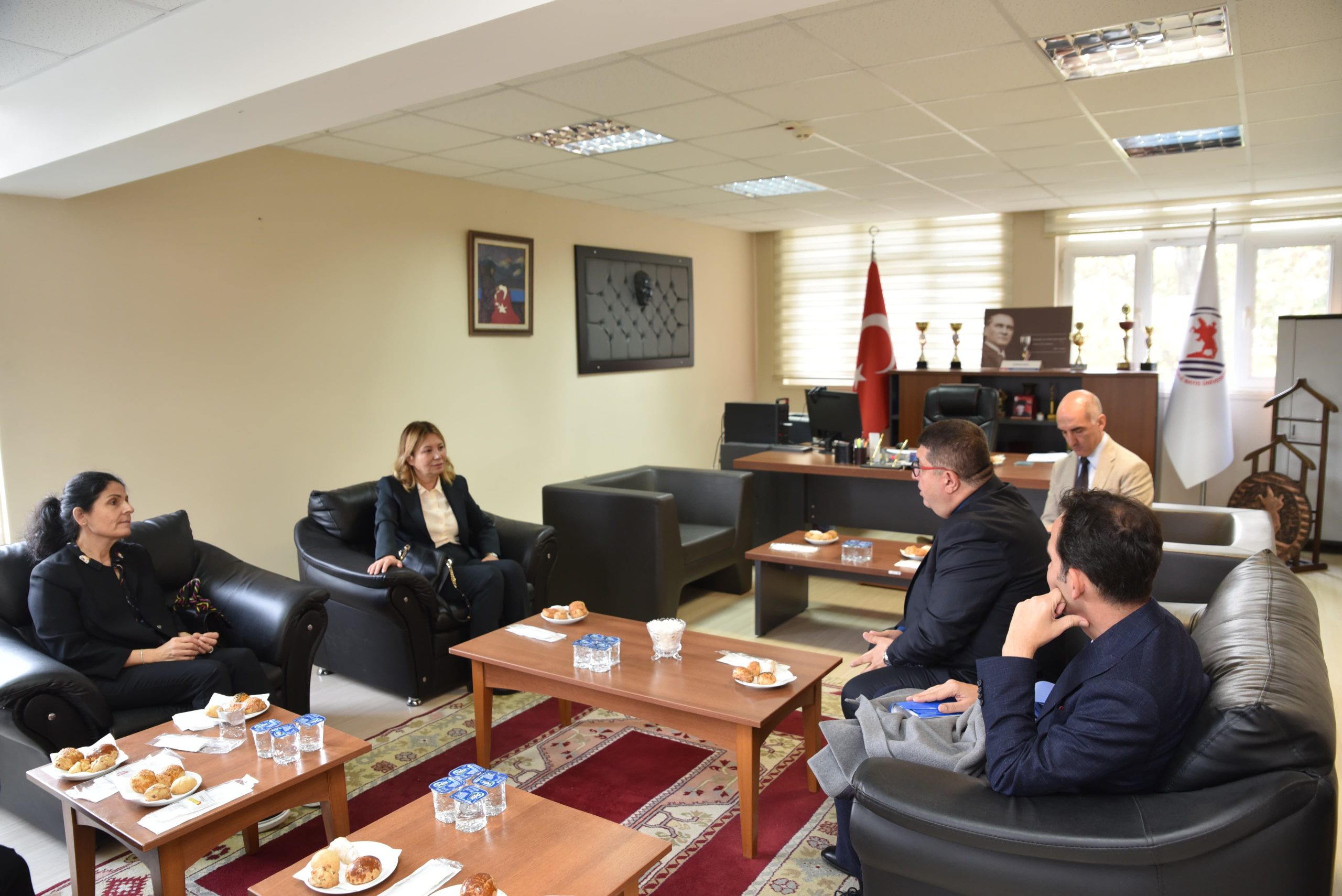 Rektör Aydın’a ziyaretleri sırasında; Rektör Yardımcıları Prof. Dr. Alper Kesten, Prof. Dr. Çetin Kurnaz, Prof. Dr. Ayşe Pınar Sumer ve Üniversite Genel Sekreteri Doç. Dr. Erhan Burak Pancar eşlik etti.